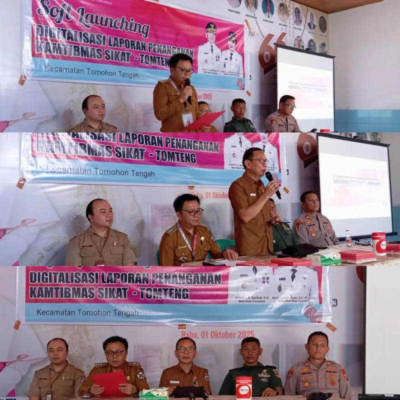 MediaRepublik.Id- Pemerintah Kecamatan Tomohon Tengah gelar soft launching Digitalisasi Laporan Penanganan Kamtibmas “SIKAT-Tomteng”. Selasa (25/11), di Wisma Bunda Hati Kudus Kolongan. Program ini menjadi inovasi baru dalam mempercepat penanganan keamanan dan ketertiban masyarakat melalui sistem pelaporan berbasis digital.
