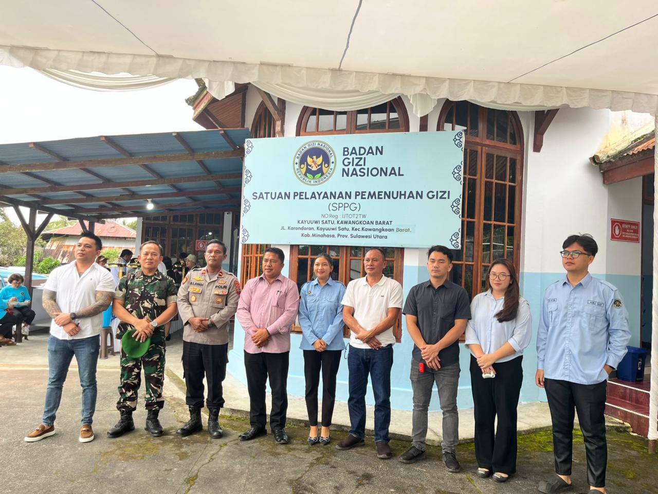Turut hadir Camat Kawangkoan Barat Heppy Lumintang, S.H., Kapolsek Kawangkoan Ipda Rinto Langi, Kepala Yayasan Anak Mas Dwipantara Yustina Septi Christiani, Pembina Yayasan SPPG Kayuuwi Satu Esther J. Malonda, Hukum Tua Desa Kayuuwi Satu, Ketua Mitra Rio Simbar, serta tenaga ahli gizi dan akuntan.