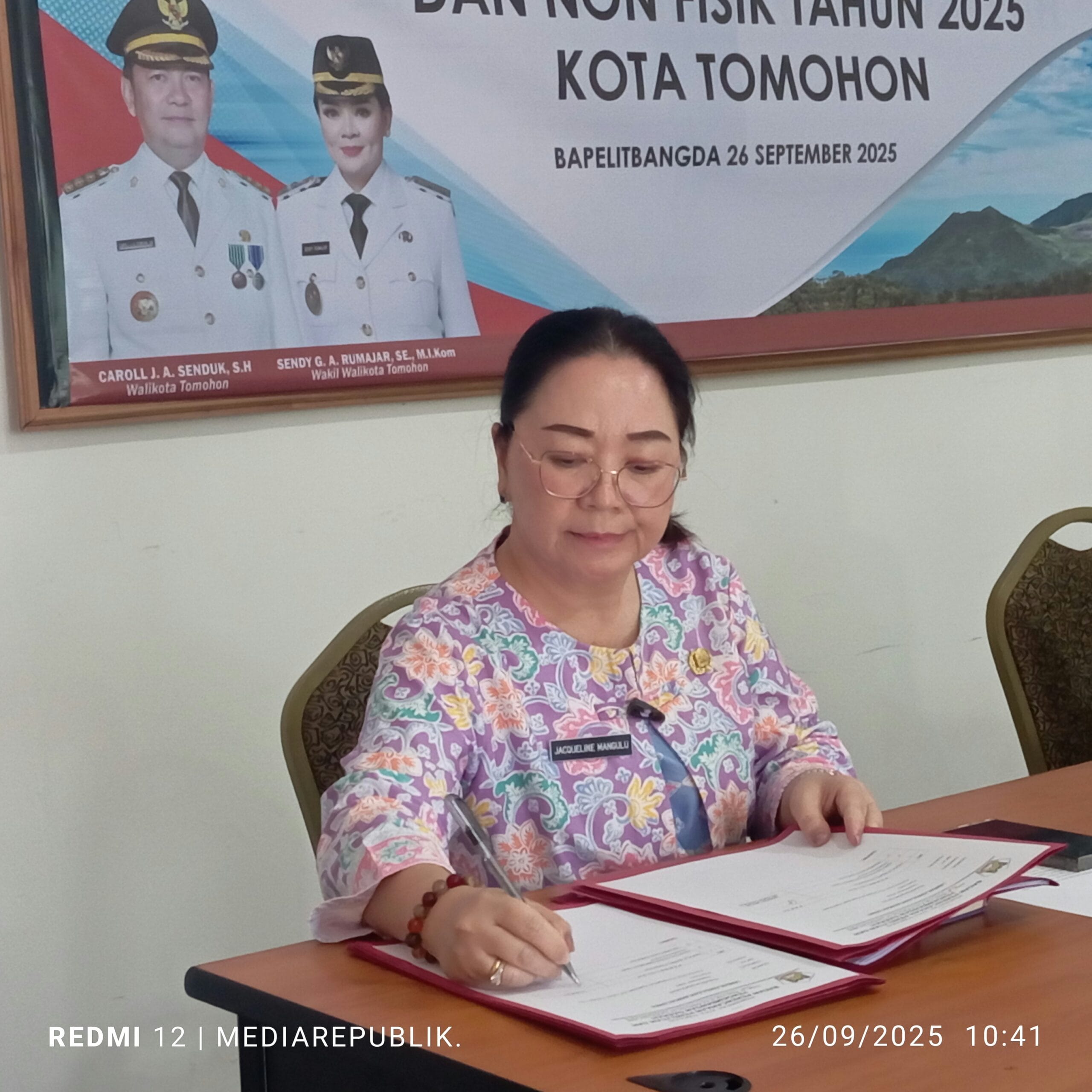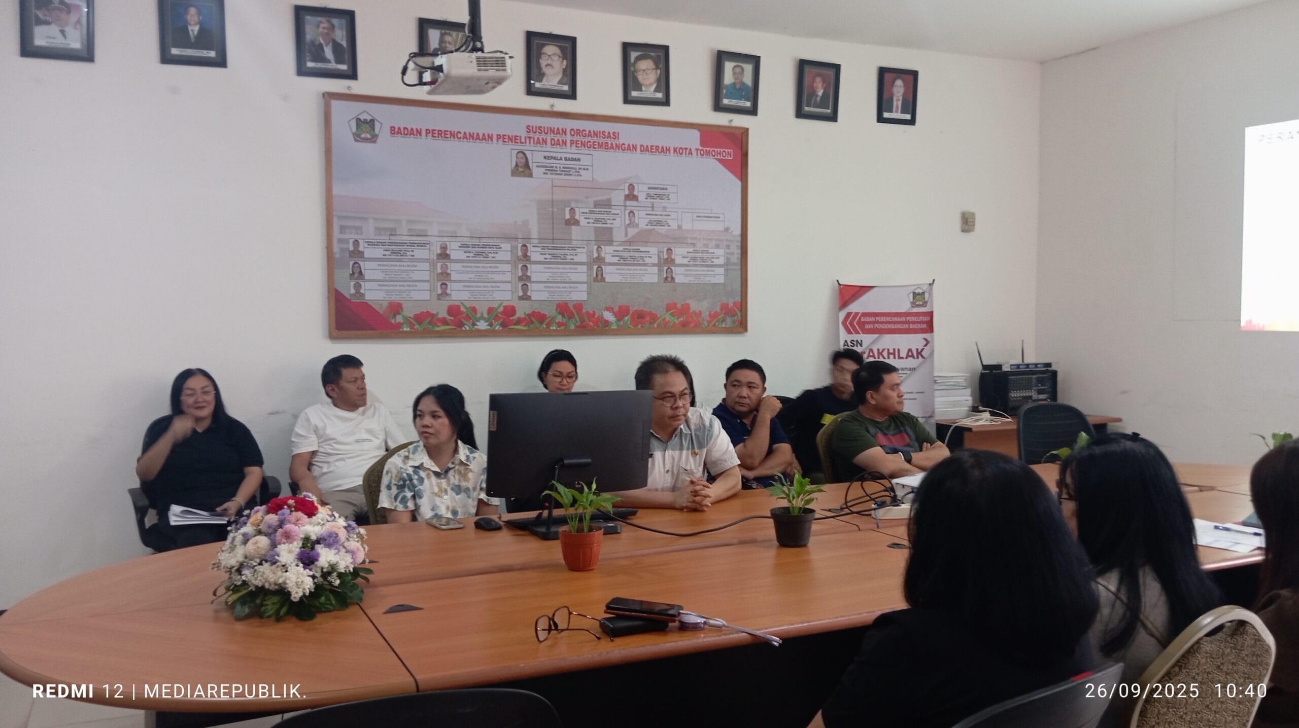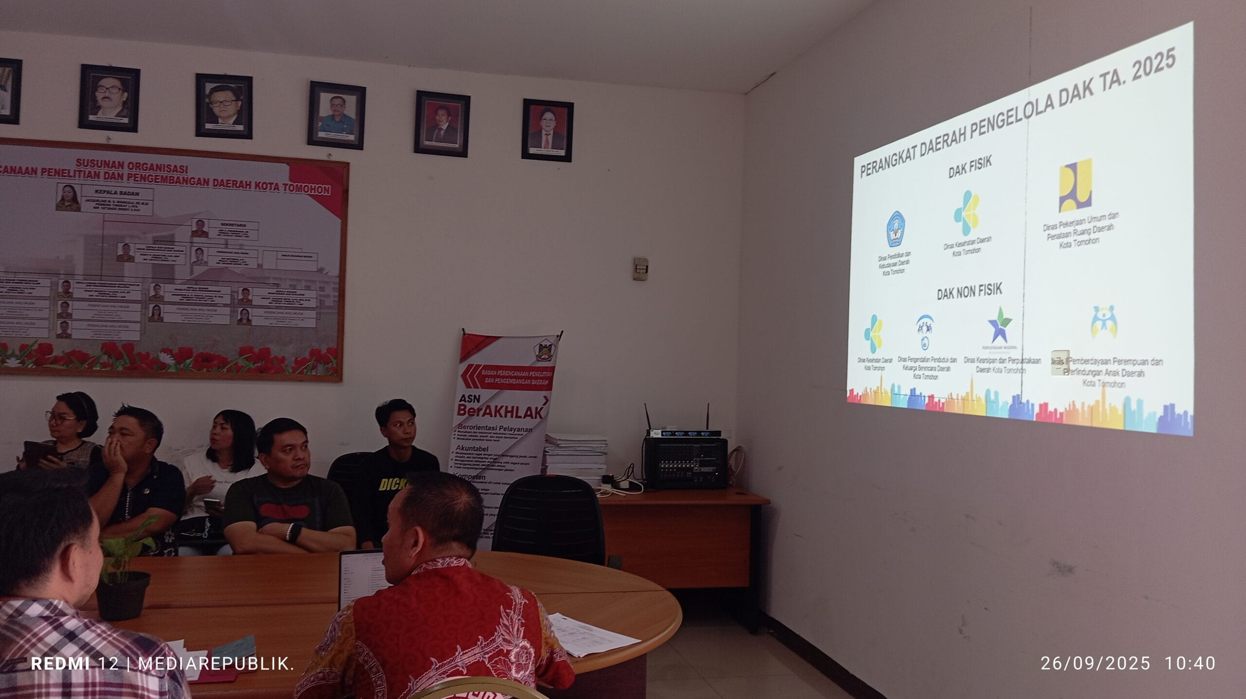 MediaRepublik. id– Badan Perencanaan, Penelitian dan Pengembangan Daerah (Bapelitbangda) Kota Tomohon menggelar Rapat Verifikasi dan Evaluasi DAK Fisik dan Non Fisik TA 2025 Kota Tomohon, bertempat di Ruangan Kantor Bapelitbangda Kota Tomohon, Jumat (26/09). Rapat tersebut dibuka langsung oleh Asisten II Setdakot Tomohon Lilly Solang didampingi oleh Kepala Bapelitbangda Kota Tomohon Jacqueline Mangulu.