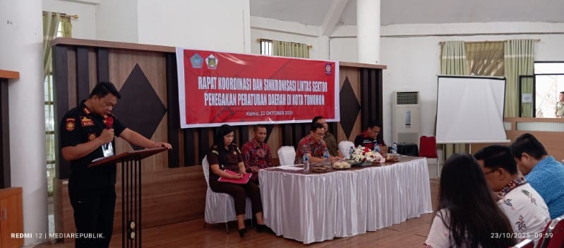 MediaRepublik.Id – Pemerintah Kota Tomohon melalui Satuan Polisi Pamong Praja menggelar Rapat Koordinasi dan Sinkronisasi Lintas Sektor Penegakan Peraturan Daerah, Kamis (23/10), di Ruang Rapat Sekretariat Daerah Kota Tomohon.
