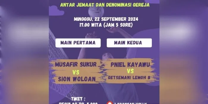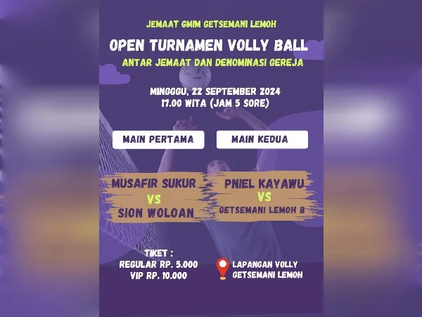 MediaRepublik.id|| Open Turnamen Volly Ball Getsemani Lemoh antar Jemaat dan Denominasi Gereja memasuki hari kedua pada Minggu (22/09). Pertandingan yang dimulai pukul 17.00 WITA akan mempertemukan empat tim unggulan, yakni Musafir Sukur, Sion Woloan, PNIEL Kayawu, dan Getsemani Lemoh B.