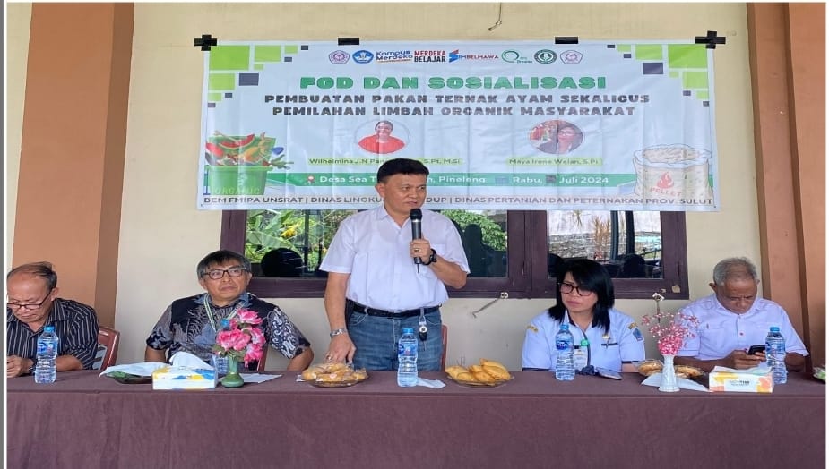 MediaRepublik.id|| Tim Program Penguatan Kapasitas Ormawa (PPKO) Badan Eksekutif Mahasiswa Fakultas Matematika dan ilmu Pengetahuan Alam (BEM FMIPA) Universitas Sam Ratulangi (Unsrat) Manado menyelenggarakan kegiatan sosialisasi dan Focus Group Discussion (FGD) tentang pembuatan pakan ternak ayam serta pemilahan limbah organik masyarakat. Rabu (17/07), di halaman Gereja GMIM Sea Tumpengan, Desa Sea Tumpengan.